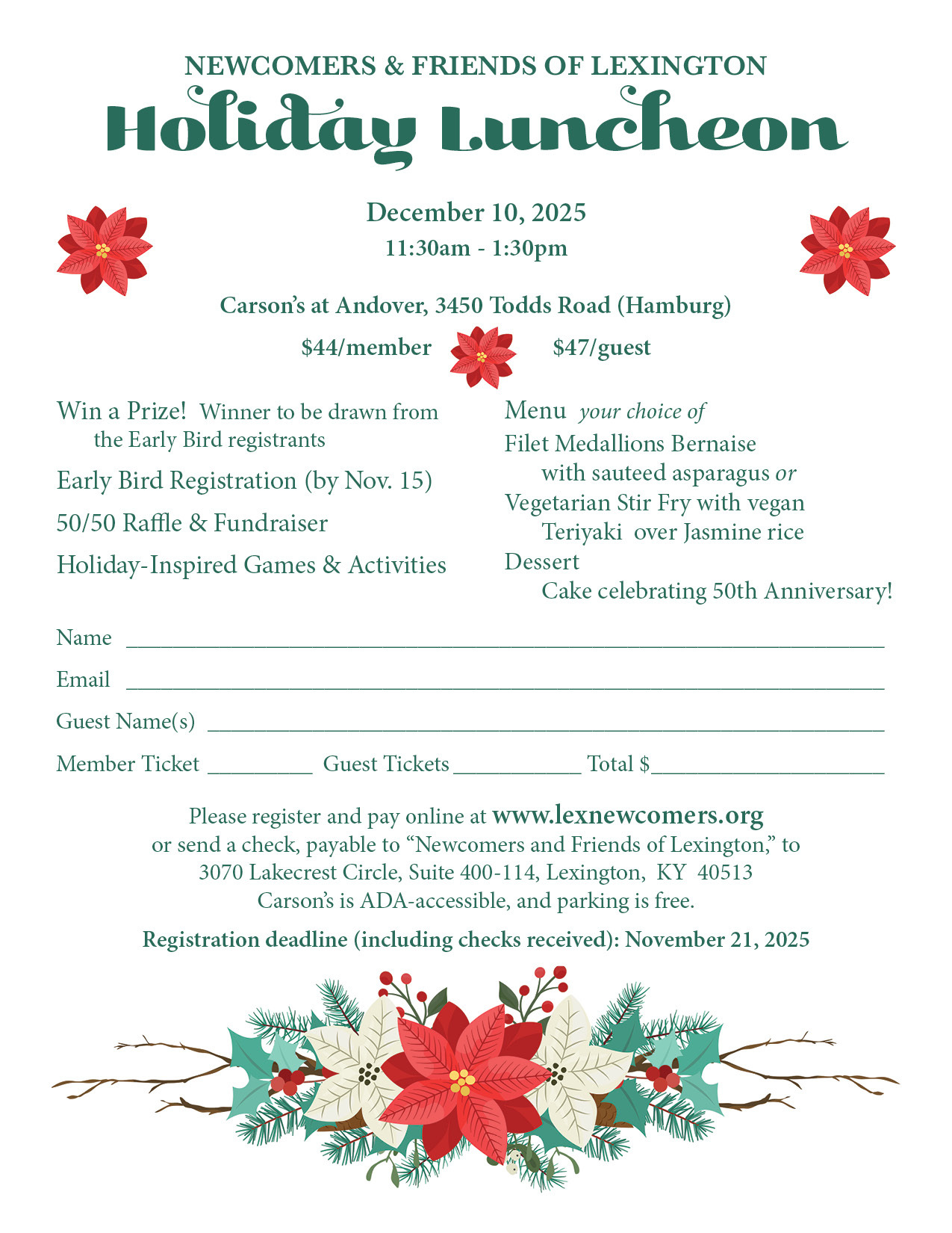Finally, save the date for our Holiday Lunch on Wednesday, December 10, at Carsons at Andover. In addition to a wonderful meal and musical entertainment, we’ll celebrate the 50th anniversary of our club! Members: